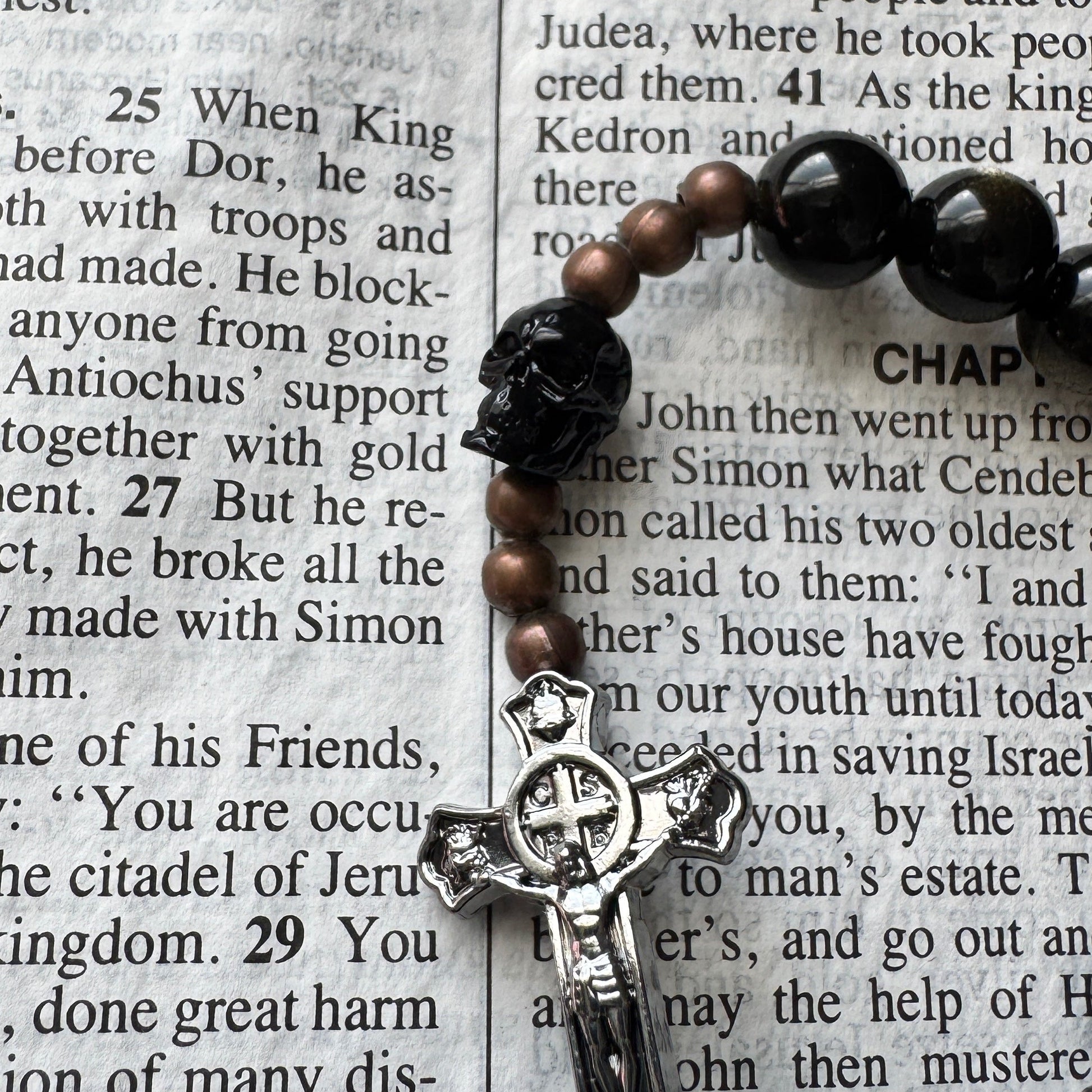 Deep black obsidian Ave beads radiate power and resilience, anchored by copper spacers that call to mind forged metal and the heat of battle. At the center stands the Crux Invicta Crucifix, a mark of strength, sacrifice, and the unbreakable victory of the Cross.
